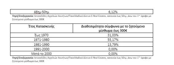Παράλληλα, το 53,06% των διαθέσιμων κατοικιών με ζητούμενο μίσθωμα έως 300€, είναι κυρίως γκαρσονιέρες από 21τμ έως 30τμ, κατοικίες που ως επί των πλείστων είναι κατασκευής 1970-1980.