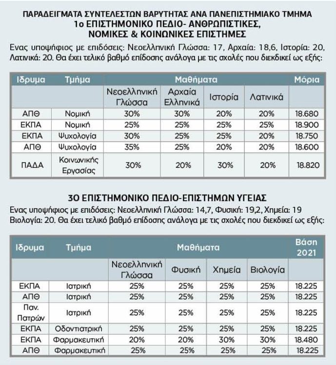 Για παράδειγμα, οι Νομικές σε Θεσσαλονίκη και Αθήνα έχουν διαφοροποιημένους συντελεστές, με την πρώτη σχολή να «πριμοδοτεί» με 30% συντελεστή τα μαθήματα της Νεοελληνικής Γλώσσας και των Αρχαίων, ενώ στη δεύτερη περίπτωση «μοιράζεται» και στα τέσσερα μαθήματα ο ίδιος συντελεστής βαρύτητας (25%). Ένας υποψήφιος διεκδικεί με διαφορετικό μέσο όρο επίδοσης τη Νομική Θεσσαλονίκης απ’ ό,τι τη Νομική Αθήνας.
