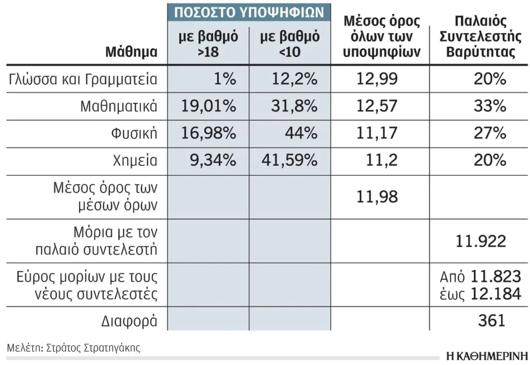 Πάντως, τα νερά των φετινών Πανελληνίων μένουν αχαρτογράφητα καθώς με το προηγούμενο σύστημα σε κάθε επιστημονικό πεδίο υπήρχαν δύο μαθήματα βαρύτητας, οι βαθμοί στα οποία πολλαπλασιάζονταν με 1,3 και 0,7, ενώ στα άλλα δύο δεν υπήρχαν συντελεστές.