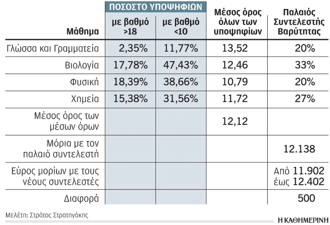 Πράγματι, σύμφωνα με τον κ. Στρατηγάκη, με τον παλαιό τρόπο υπολογισμού των μορίων ο υποψήφιος που θα έγραφε τον μέσο όρο θα συγκέντρωνε 10.033 μόρια, ενώ με τον νέο τρόπο υπολογισμού θα συγκέντρωνε από 9.648 έως 10.693 μόρια. Δηλαδή, το εύρος των τιμών είναι 1.045 μονάδες, ενώ το μέγιστο της βαθμολογίας που μπορεί να συγκεντρώσει φέτος ένας υποψήφιος σε σχέση με το 2021 είναι σχεδόν 700 μόρια παραπάνω.