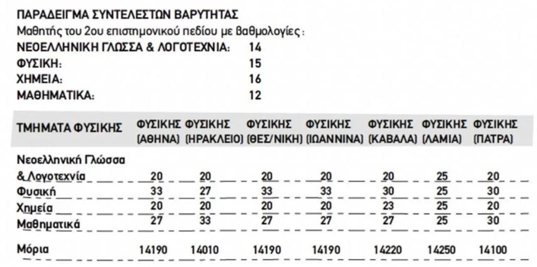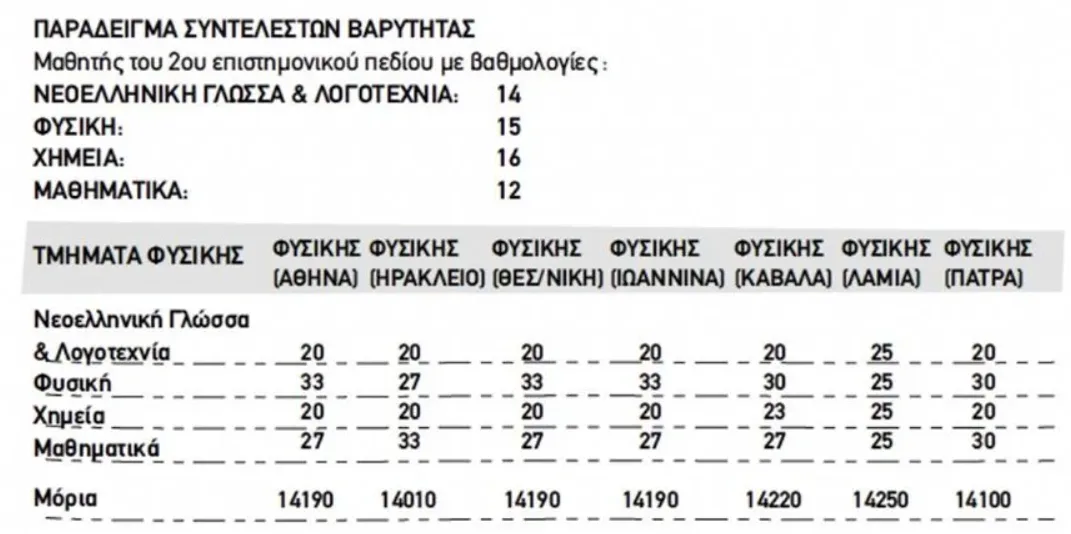 2. Ακόμη και ομοειδή τμήματα π.χ. Φυσικό, δεν έχουν ορίσει όμοιους συντελεστές, με αποτέλεσμα ένας υποψήφιος να έχει συγκεντρώσει διαφορετικά μόρια εισαγωγής για κάθε τμήμα Φυσικού στο ίδιο πεδίο.