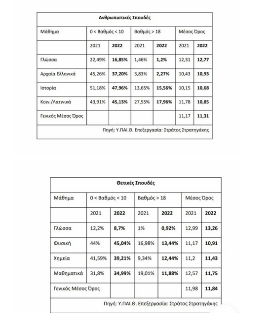 Τα Αρχαία Ελληνικά δυσκολεύουν πολύ τους υποψηφίους, με το μέσο όρο του 2022 να είναι 10,93 και τον αριθμό των αριστούχων (πάνω από 18) να περιορίζεται μόλις στο 2,27%. Λογικό είναι αφού για να γράψει καλά ένας υποψήφιος στα Αρχαία πρέπει να έχει καλή υποδομή στη γραμματική και το συντακτικό από προηγούμενες τάξεις. Η Νέα Ελληνική Γλώσσα και Λογοτεχνία είναι το μάθημα που έχει τους λιγότερους υποψηφίους με βαθμό κάτω από βάση και τους λιγότερους αριστούχους, όπως μπορείτε να δείτε στους πίνακες. Οι υποψήφιοι συνωστίζονται μεταξύ του 10 και του 18.