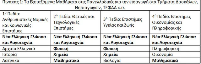 Τα μαθήματα έχουν διαφορετικό βαθμό δυσκολίας, με συνέπεια οι επιδόσεις των μαθητών να είναι διαφορετικές. Στον πίνακα 1 βλέπουμε τα εξεταζόμενα μαθήματα κάθε Πεδίου.