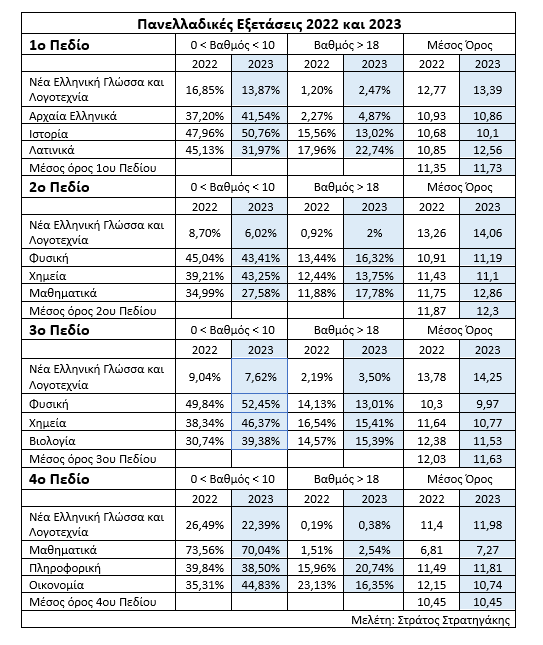 Ο μέσος όρος των δύο αυτών μαθημάτων ήταν χειρότερος το 2023, λόγω του μεγαλύτερου ποσοστού υποψηφίων που έγραψαν κάτω από τη βάση.