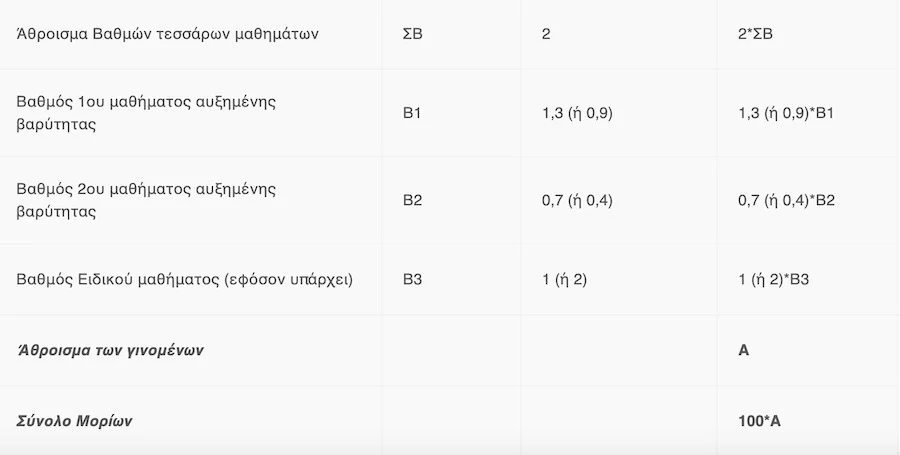 Συγκεκριμένα, ανάλογα με την Ομάδα Προσανατολισμού του υποψηφίου και το επιστημονικό πεδίο που ενδιαφέρεται να δηλώσει, υπολογίζονται και τα μόριά του με βάση τους γραπτούς βαθμούς στα τέσσερα πανελλαδικά εξεταζόμενα μαθήματα και στα ειδικά μαθήματα αν απαιτούνται.