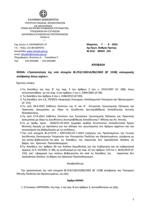 Στις Πανελλήνιες 2024 θα ισχύσουν αλλαγές στα αγωνίσματα για την εισαγωγή στα Τμήματα Επιστήμης Φυσικής Αγωγής και Αθλητισμού – Υπεγράφη από τον Υπουργό Παιδείας, Θρησκευμάτων και Αθλητισμού Κυριάκο Πιερρακάκη, η με αριθμ. Φ.253/ 88954 /Α5/7-8-2023 απόφαση, με την οποία τροποποιείται η με αριθμ. Φ.253/128314/Β6/2002 (Β’ 1538) ΥΑ του Υπουργού Εθνικής Παιδείας και Θρησκευμάτων με θέμα:
