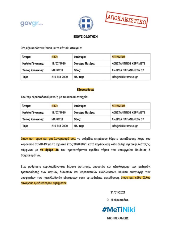 Το Παρατηρητήριο για την Παιδεία εξασφάλισε και παρουσιάζει κατ’ αποκλειστικότητα την εξουσιοδότηση που έκανε η Νίκη Κεραμέως… στη Νίκη Κεραμέως, μέσω της νέας διαδικτυακής πύλης του ελληνικού κράτους gov.gr: