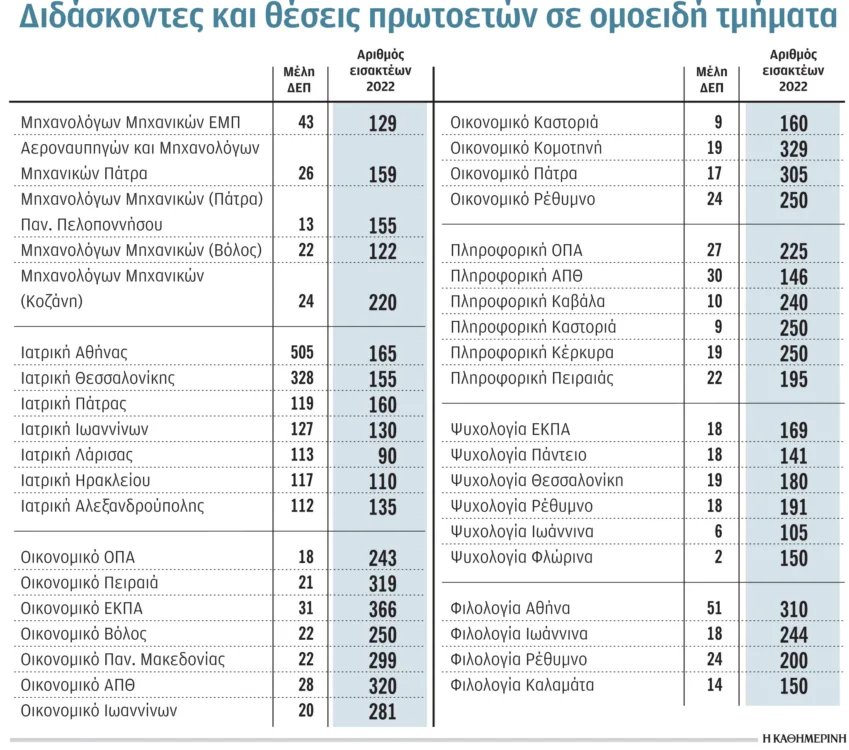 Με βάση την απόφαση του υπουργείου, τμήματα με ακριβώς το ίδιο αντικείμενο παίρνουν για το επόμενο ακαδημαϊκό έτος 2022-2023 τον ίδιο αριθμό εισακτέων, ωστόσο έχουν μεταξύ τους σημαντικές αποκλίσεις ως προς τον αριθμό των διδασκόντων.