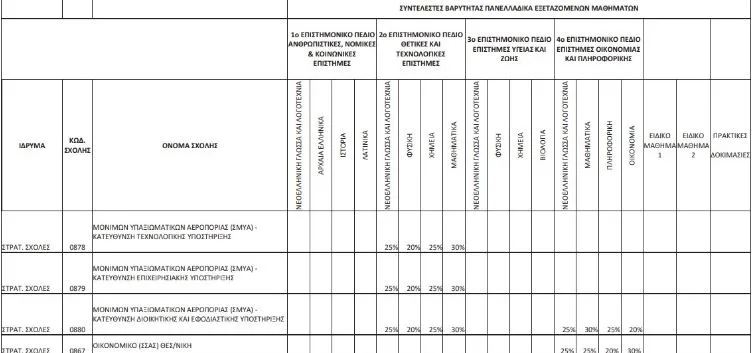 Πανελλήνιες : Tροποποίηση των συντελεστών βαρύτητας των πανελλαδικά εξεταζόμενων μαθημάτων και των ειδικών μαθημάτων, για την εισαγωγή στις στρατιωτικές σχολές.