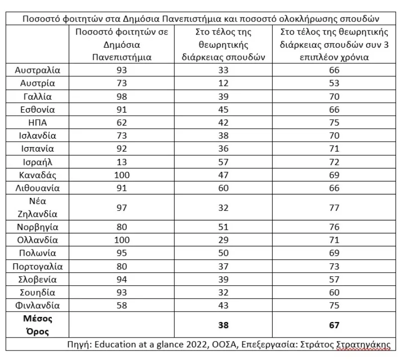 Τρία χρόνια μετά το τέλος της θεωρητικής διάρκειας σπουδών το 53% στην Αυστρία και το 57% των φοιτητών έχουν πάρει το πτυχίο τους. Στις άλλες χώρες το ποσοστό είναι από 60% έως 77% στη Νέα Ζηλανδία, με μέσο όρο το 67% στις χώρες που εξετάστηκαν. Σ’ αυτό το εύρος ανήκει και η Ελλάδα, με το Υπουργείο Παιδείας να δίνει ποσοστό ολοκλήρωσης σπουδών το 70%. Λογικά, λοιπόν, είμαστε κοντά στο μέσο όρο αποφοίτησης των υπόλοιπων χωρών, άρα δεν υπάρχει κάποιο ιδιαίτερο πρόβλημα στη χώρα μας.