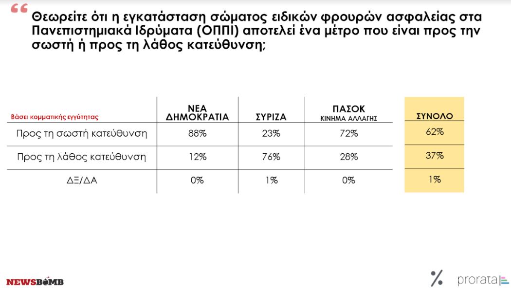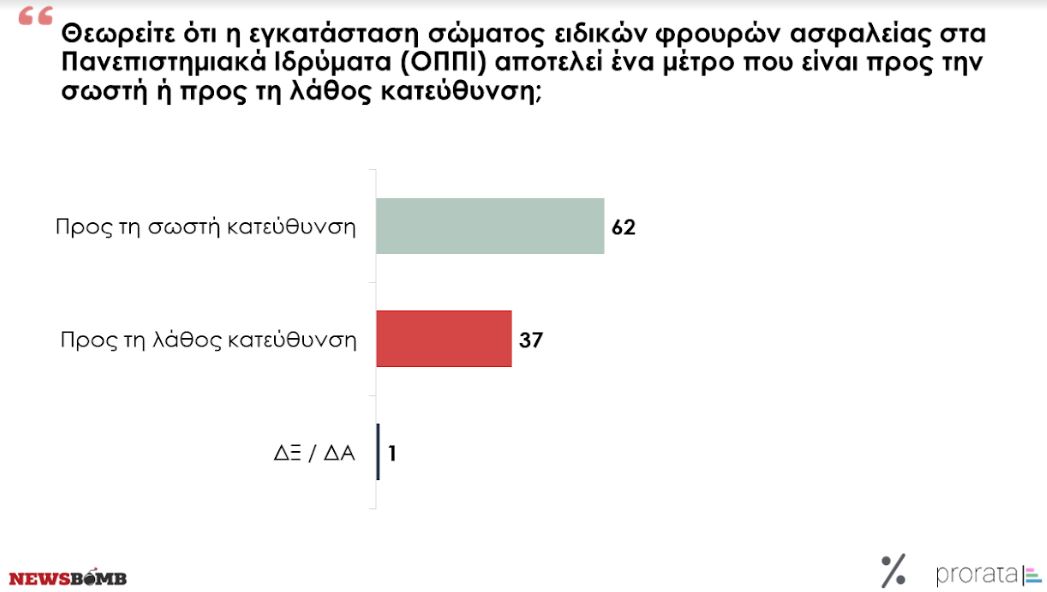 Η πλειονότητα των ερωτώμενων τάσσεται με την άποψη πως η εγκατάσταση του σώματος ειδικών φρουρών ασφαλείας στα Πανεπιστημιακά Ιδρύματα είναι ένα μέτρο προς τη σωστή κατεύθυνση. Συγκεκριμένα, το 62% θεωρεί πως οι ΟΠΠΙ αποτελούν μία θετική εξέλιξη έναντι 37% που δήλωσε πως το παραπάνω μέτρο κινείται προς τη λάθος κατεύθυνση.