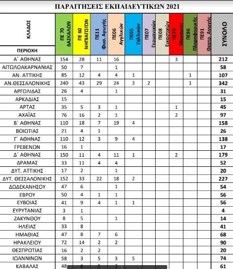 Πίνακα με τις παραιτήσεις εκπαιδευτικών σε όλη τη χώρα κοινοποίησε η Δημοκρατική Συνεργασία Εκπαιδευτικών Π.Ε. σε ανακοίνωση της.