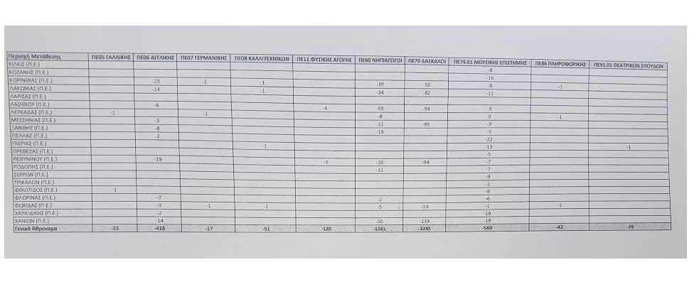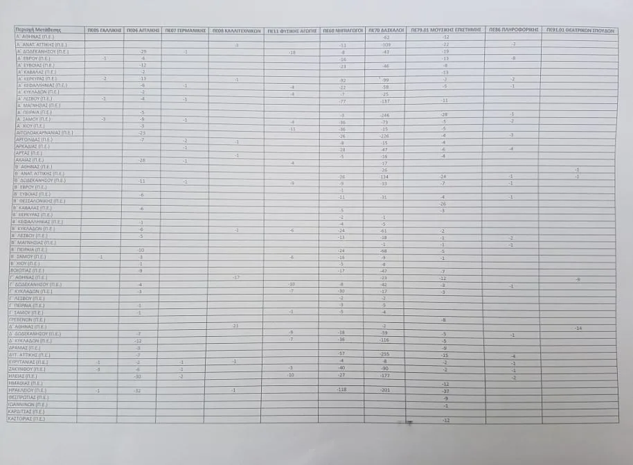 Πίνακας οργανικών κενών ανά ειδικότητα και ανά Διεύθυνση Εκπαίδευσης