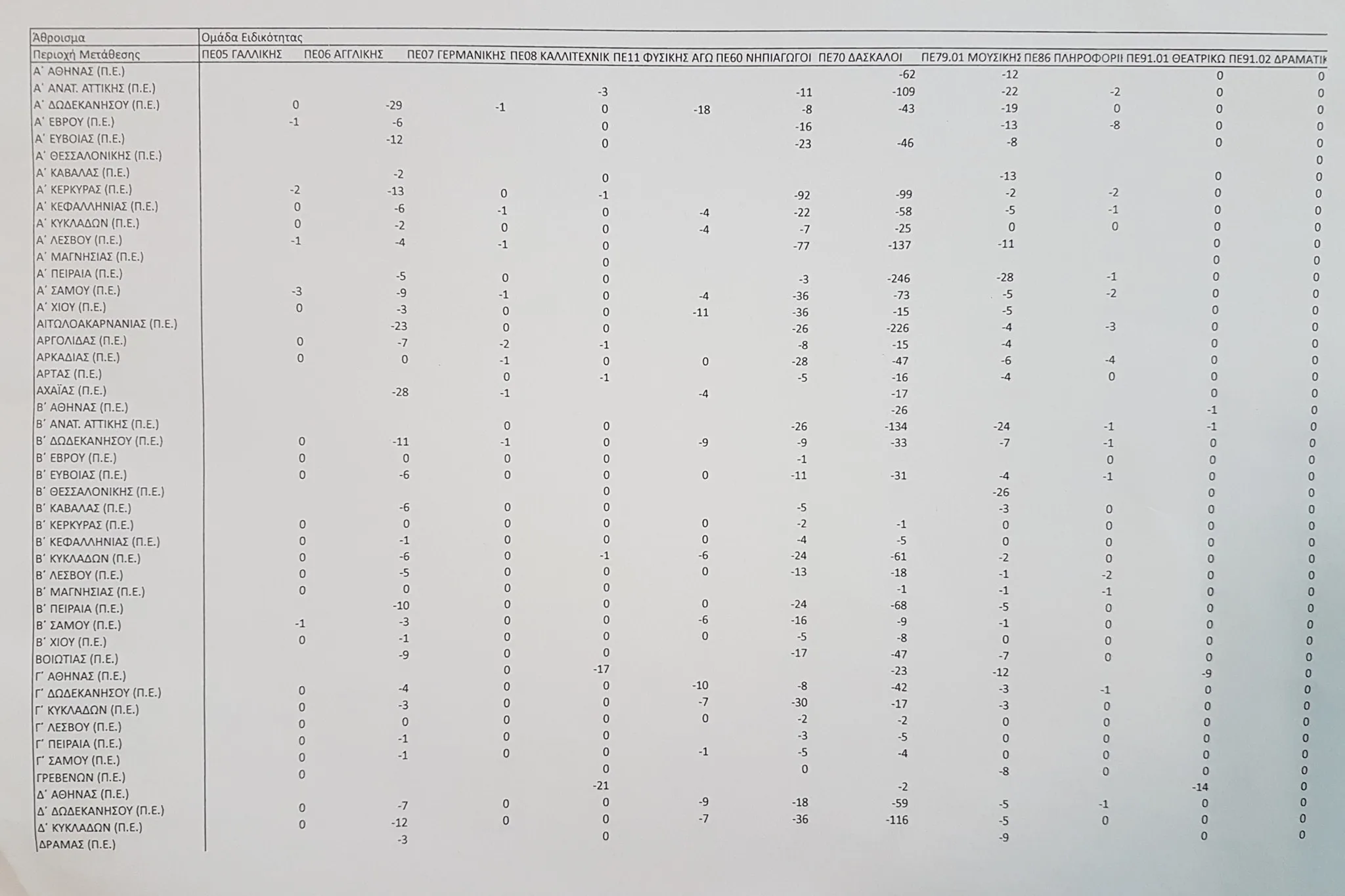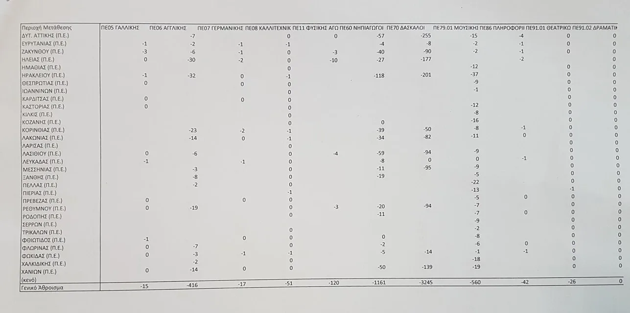 Πίνακες με τα οργανικά κενά Πρωτοβάθμιας ανά περιοχή μετάθεσης και ειδικότητα