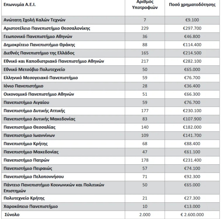 Δημοσιεύτηκε το ΦΕΚ με ττη χρηματοδότηση 2,6 εκ. ευρώ των ΑΕΙ της χώρας προκειμένου να τα διαθέσουν μέσω 2.000 υποτροφιών, σε μεταπτυχιακούς φοιτητές και υποψήφιους διδάκτορες