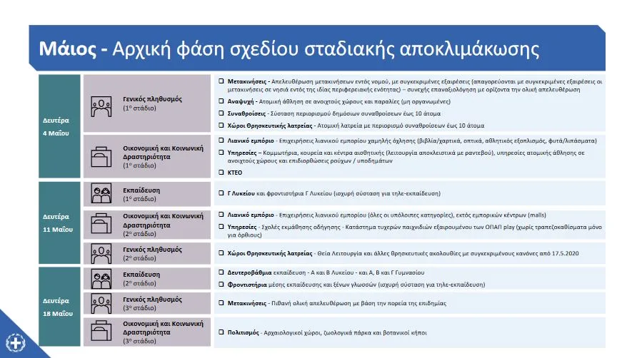 Μετά το μήνυμα του πρωθυπουργού Κυριάκου Μητσοτάκη προς τους πολίτες για την υφιστάμενη κατάσταση όσον αφορά τον κορονοϊό αλλά και την παρουσίαση του οδικού χάρτη για το πώς θα επανέλθουμε σε μια κανονικότητα «υγειονομική», ακολούθησε η αναλυτική παρουσίαση του κυβερνητικού σχεδίου για την σταδιακή έξοδο από την καραντίνα.