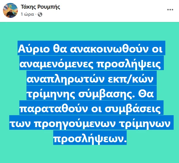 Προσλήψεις αναπληρωτών 2022: Σύμφωνα μα ανακοίνωση του αιρετού, Τάκη Ρουμπή, αύριο αναμένεται να ανακοινωθούν οι ΝΕΕΣ προσλήψεις. Συγκεκριμένα στην ανάρτησή του αναφέρει: Αύριο θα ανακοινωθούν οι αναμενόμενες προσλήψεις αναπληρωτών εκπ/κών τρίμηνης σύμβασης. Θα παραταθούν οι συμβάσεις των προηγούμενων τρίμηνων προσλήψεων. Κατά πληροφορίες, αναμένεται να γίνουν 800 περίπου προσλήψεις αναπληρωτών τρίμηνης σύμβασης.
