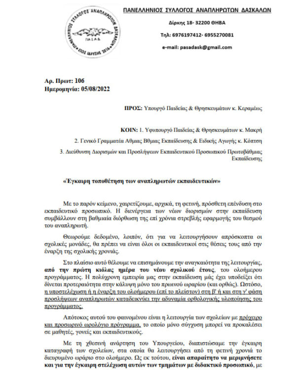 Προσλήψεις αναπληρωτών: O ΠΑΣΑΔ έστειλε επίσημο έγγραφο στο Υπουργείο ώστε όλα τα προγράμματα να δοθούν από την πρώτη φάση (Παράλληλη, Ολοήμερο, ΖΕΠ, ΔΥΕΠ).