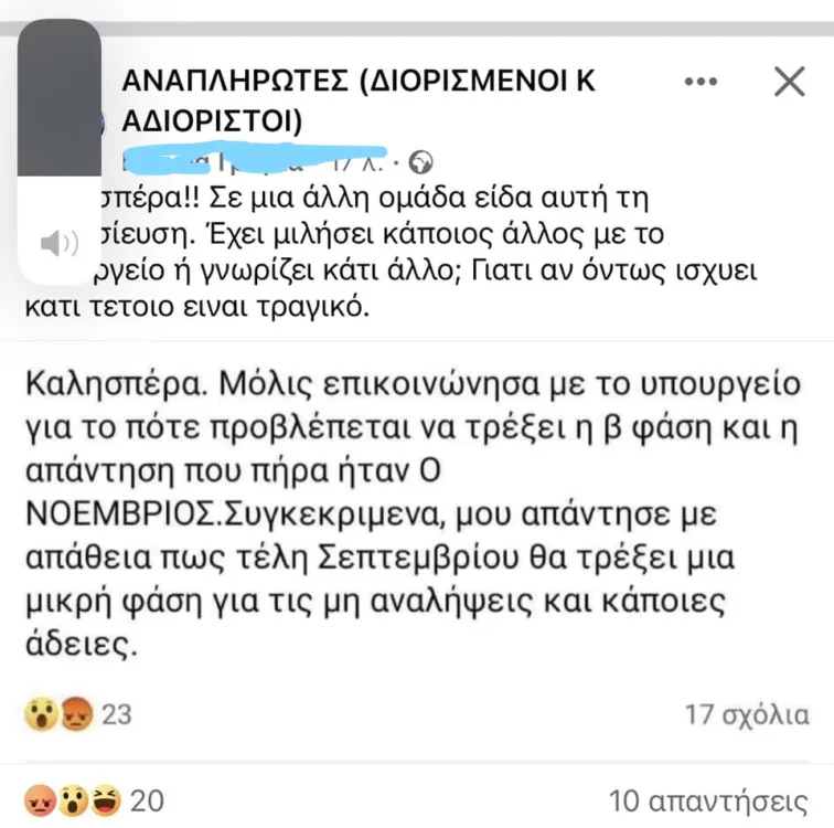 Ωστόσο, δεν αποκλείτεται τα ονόματα να ανακοινωθούν και αρχές Οκτωβρίου. Εντύπωση προκάλεσε η ανάρτηση εκπαιδευτικού που επικοινώνησε, όπως λέει, με το Υπουργείο Παιδείας και του ανέφεραν πως η Β’ φάση αναμένεται τον Νοέμβριο! Κάτι τέτοιο, θα δημιουργήσει τρομερά προβλήματα στην ομαλή λειτουργία των σχολείων οπότε παραθέτουμε την πληροφορία με κάθε επιφύλαξη: