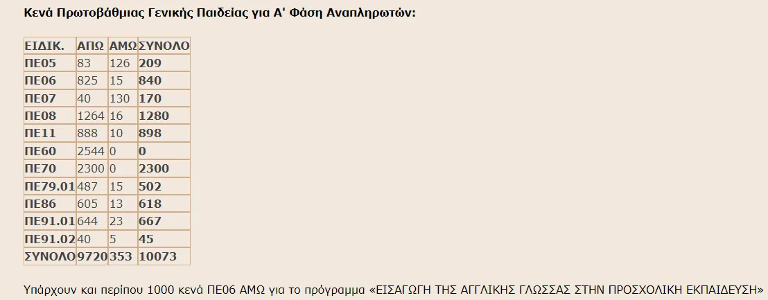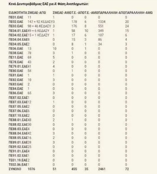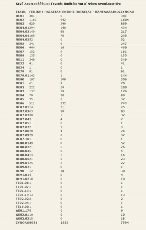 Δείτε αναλυτικούς πίνακες και εκτιμήσεις για τις προσλήψεις αναπληρωτών – Τα κενά για την Δευτεροβάθμια Ειδική Αγωγή και Εκπαίδευση (ΕΑΕ), την Δευτεροβάθμια Γενική Εκπαίδευση και την Πρωτοβάθμια Γενική Εκπαίδευση, τα οποία θα χρησιμοποιηθούν για τις προσλήψεις αναπληρωτών εκπαιδευτικών 2023-24 και οι οποίες θα ανακοινωθούν από το ΥΠΑΙΘΑ αύριο Πέμπτη 31 Αυγούστου 2023, κοινοποίησε ο “Πατρέας” στο forum pde.