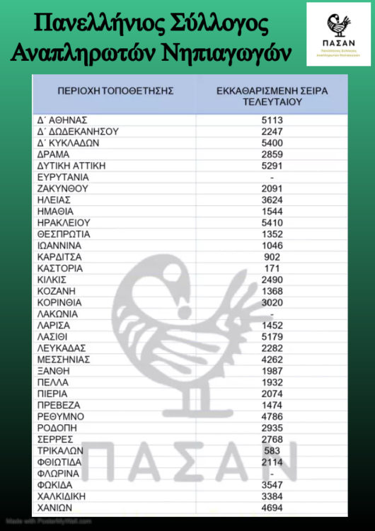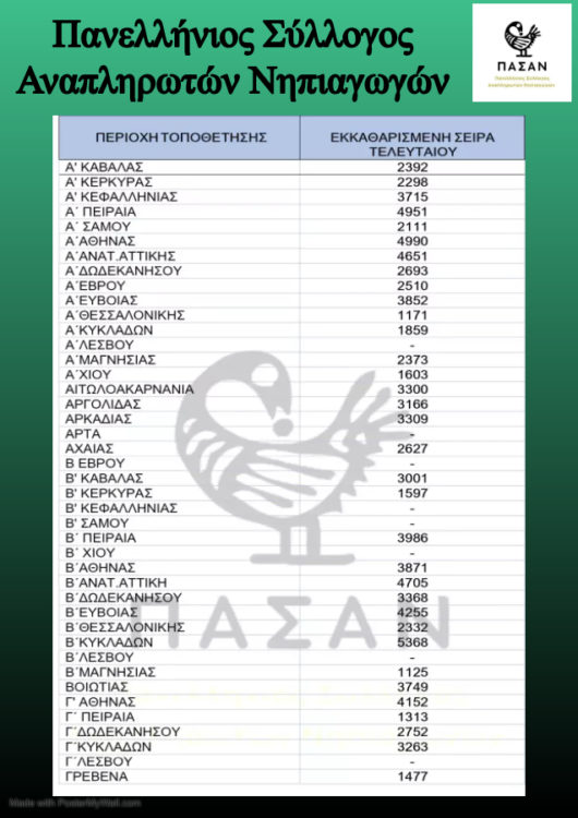 Μετά την έκδοση από το ΑΣΕΠ των Προσωρινών Πινάκων της 1ΓΕ/2023 και προς διευκόλυνση των υποψηφίων αναπληρωτών, ο Πανελλήνιος Σύλλογος Αναπληρωτών Νηπιαγωγών (ΠΑΣΑΝ) κοινοποίησε Πίνακα με τον περσινό αριθμό τελευταίου εισαχθέντα ανά περιοχή στην Α φάση προσλήψεων, ενημερωτικό σχετικά με το πως να υπολογίσει κανείς τα κενά στις περιοχές που τον ενδιαφέρουν, τις εξ΄ ολοκλήρου Δυσπρόσιτες περιοχές και τον εκκαθαρισμένο Πίνακα ΠΕ60, έχοντας αφαιρέσει τον αριθμό των διορισθέντων στη Γενική εκπαίδευση.