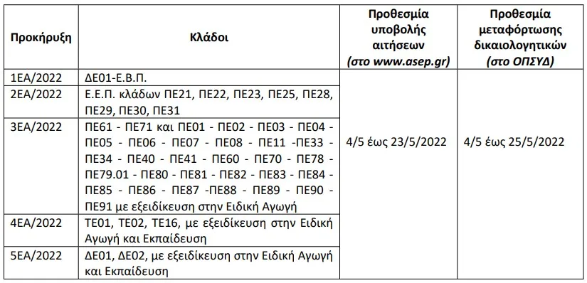 Στο ίδιο άρθρο παρ. 5: «Τα στοιχεία των ηλεκτρονικών αιτήσεων των υποψήφιων εκπαιδευτικών, μελών Ε.Ε.Π. και Ε.Β.Π. που θα υποβληθούν στο Α.Σ.Ε.Π. θα διασταυρωθούν με τη χρήση Τεχνολογιών Πληροφορικής και Επικοινωνιών (Τ.Π.Ε.) με τα αντίστοιχα στοιχεία που είναι καταχωρισμένα στους ηλεκτρονικούς φακέλους των εκπαιδευτικών και μελών Ε.Ε.Π. και Ε.Β.Π. στο Ο.Π.Σ.Υ.Δ. και όποτε κριθεί αναγκαίο από το ΑΣΕΠ, θα αποστέλλονται σε αυτό τα σχετικά δικαιολογητικά των υποψηφίων.»