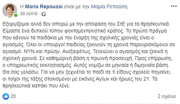«Εξοργίζομαι αλλά δεν απορώ με την απόφαση του ΣτΕ για τα θρησκευτικά. Είμαστε ένα δυτικού τύπου φονταμενταλιστικό κράτος. Το πρώτο πράγμα που κάνουν τα παιδάκια με την έναρξη της σχολικής χρονιάς είναι ο αγιασμός», τόνισε χαρακτηριστικά η κ. Ρεπούση αναφορικά με το ζήτημα με ανάρτηση της στο facebook.