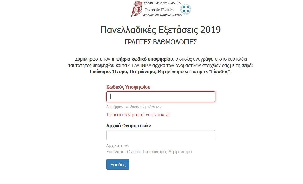 ΑΠΟΤΕΛΕΣΜΑΤΑ ΠΑΝΕΛΛΗΝΙΩΝ 2019 | results.it.minedu.gov.gr | Στην ιστοσελίδα http://results.it.minedu.gov.gr μπουρούν οι υποψήφιοι να δουν τη βαθμολογία τους πληκτρολογώντας τον 8-ψήφιο κωδικό τους και τους 4 αρχικούς χαρακτήρες από το επώνυμο, το όνομα, το πατρώνυμο και το μητρώνυμο του υποψηφίου σε κεφαλαίους ελληνικούς χαρακτήρες.
