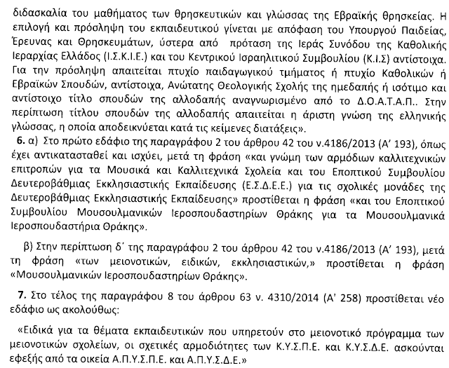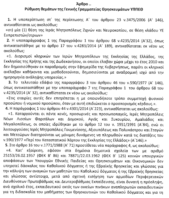 Ψηφίζεται την Παρασκευή 6/5/2016 στην Ολομέλεια της Βουλής πολυτροπολογία του Υπουργείου Παιδείας με την οποία μεταξύ άλλων γίνεται και Ρύθμιση θεμάτων της Γενικής Γραμματείας Θρησκευμάτων ΥΠΠΕΘ. Τα θέματα της Γ.Γραμματείας Θρησκευμάτων που ρυθμίζονται αφορούν σε προσωποπαγείς Μητροπόλεις, διορισμούς κληρικών αλλά και τους διδάσκοντες το μάθημα των Θρησκευτικών σε μαθητές του Καθολικού δόγματος ή της Εβραϊκής θρησκείας.