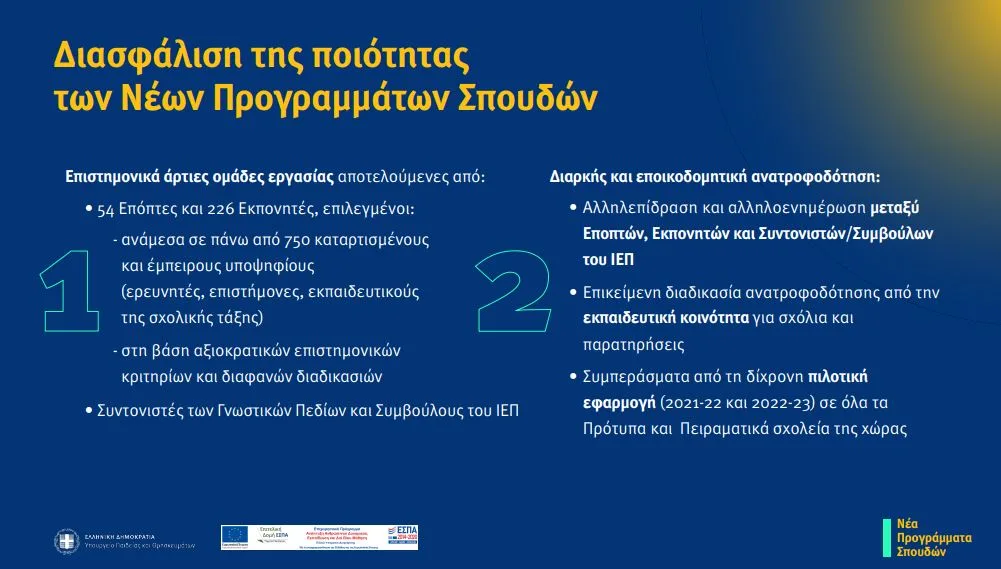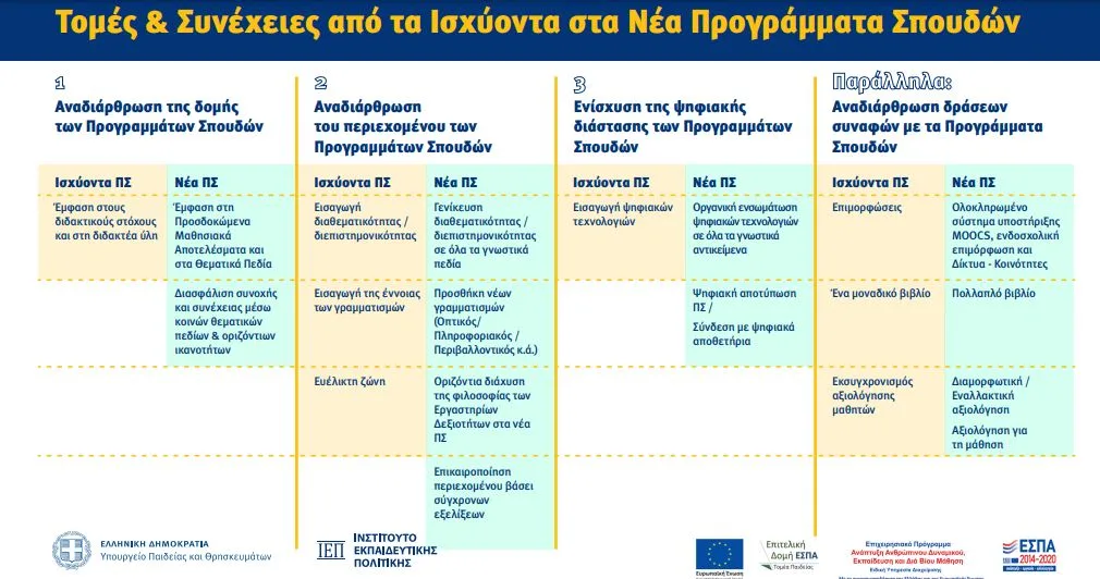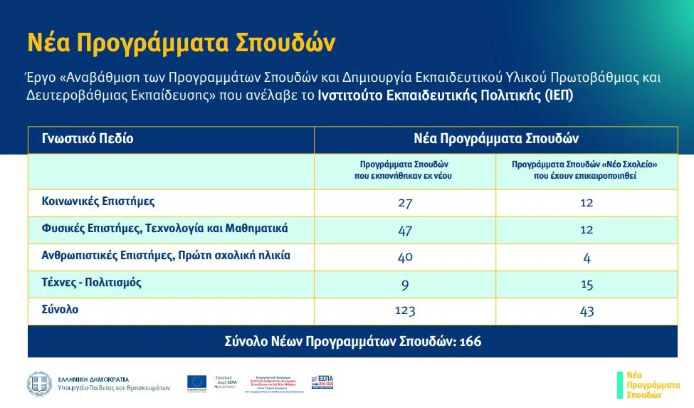 Έρχονται 166 νέα προγράμματα σπουδών τα οποία θα εφαρμοστούν πιλοτικά σε Πρότυπα και Πειραματικά σχολεία από φέτος αλλά η καθολική εφαρμογή θα πραγματοποιηθεί το 2023 .