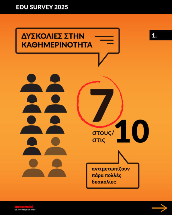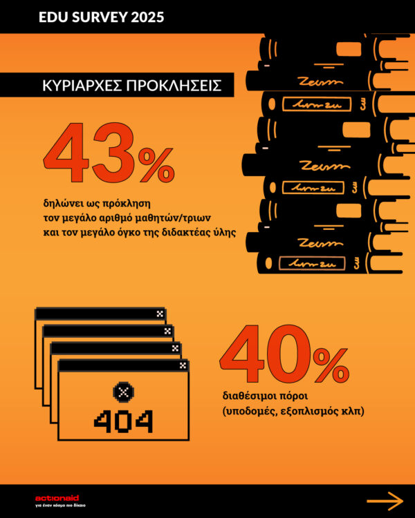 Με αφορμή τη Διεθνή Ημέρα Εκπαίδευσης (24 Ιανουαρίου), η ActionAid παρουσιάζει τα αποτελέσματα μιας νέας ερευνητικής άσκησης με εκπαιδευτικούς από όλη την Ελλάδα. Στόχος ήταν να κατανοήσουμε βαθύτερα τις προκλήσεις της σχολικής καθημερινότητας, να ακούσουμε τις ανάγκες της εκπαιδευτικής κοινότητας και να αναζητήσουμε νέους δρόμους συνεργασίας για ένα σχολείο πιο συμπεριληπτικό και ουσιαστικό.