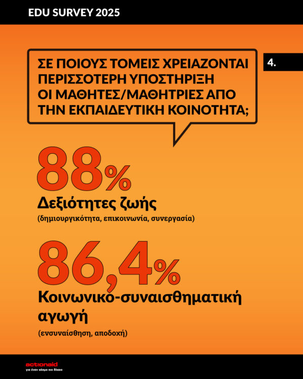 Την ίδια στιγμή, οι εκπαιδευτικοί τονίζουν ότι οι μαθητές και μαθήτριες χρειάζονται ενίσχυση κυρίως σε δεξιότητες ζωής, συνεργασίας, επικοινωνίας και ενσυναίσθησης. Δεν ζητούν απλώς περισσότερο γνωστικό περιεχόμενο, αλλά εργαλεία που καλλιεργούν ενεργούς, υπεύθυνους και συμπεριληπτικούς πολίτες.