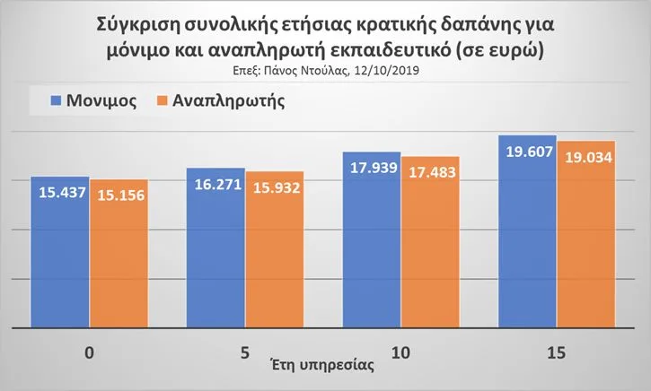 Μελετώντας τα μισθολογικά των Αναπληρωτών εκπαιδευτικών, διαπίστωσα με έκπληξη το εξής: η συνολική ετήσια κρατική δαπάνη (δηλ όλα μέσα, μισθός, και κρατήσεις, και εισφορές, και επιδόματα αδειας και ανεργίας) για έναν αναπληρωτή είναι περίπου ίδια με έναν μόνιμο εκπαιδευτικό (!).