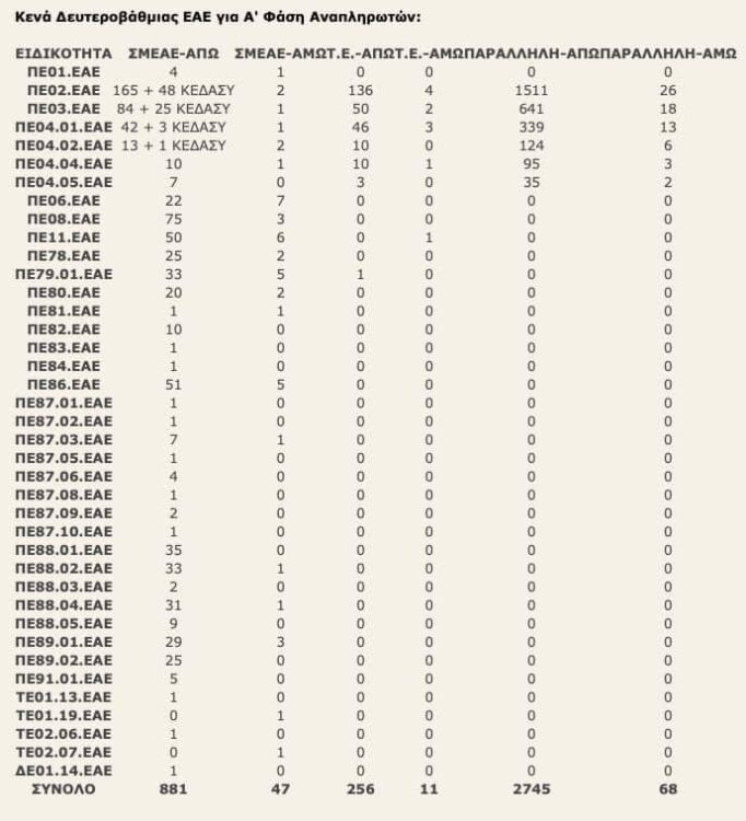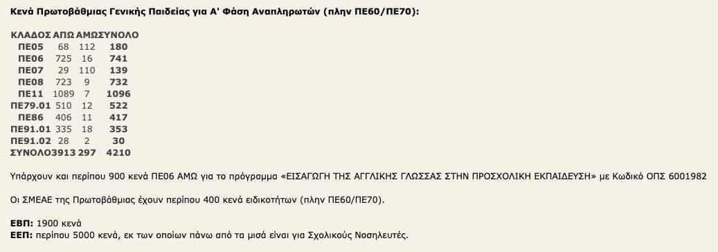 Προσλήψεις αναπληρωτών: Τα δηλωθέντα κενά αναπληρωτών εκπαιδευτικών Πρωτοβάθμιας Γενικής Παιδείας (πλην ΠΕ60/ΠΕ70), Δευτεροβάθμιας ΕΑΕ, Δευτεροβάθμιας Γενικής Παιδείας και μελών ΕΕΠ-ΕΒΠ με βάση τα οποία θα πραγματοποιηθούν προσλήψεις αναπληρωτών στα πλαίσια της Α Φάσης, κοινοποίησε ο εκπαιδευτικός αναλυτής “Πατρέας” στο forum pde.