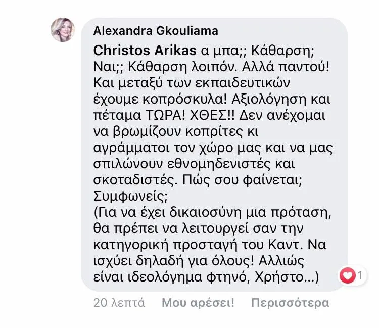 «… Και μεταξύ των εκπαιδευτικών έχουμε κοπρόσκυλα! Αξιολόγηση και πέταμα ΤΩΡΑ! ΧΘΕΣ!! Δεν ανέχομαι να βρωμίζουν κοπρίτες κι αγράμματοι τον χώρο μας και να μας σπιλώνουν εθνομηδενιστές και σκοταδιστές».