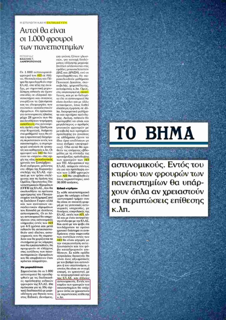Στην εφημερίδα «ΒΗΜΑ της Κυριακής» δημοσιεύτηκε η πληροφορία πως το κυβερνητικό σχέδιο για την ίδρυση νέου αστυνομικού σώματος, για τη δήθεν προστασία των ΑΕΙ, περιλαμβάνει αποθήκες οπλισμού εντός των Πανεπιστημίων, αναφέρει ο ΣΥΡΙΖΑ σε ανακοίνωση του.