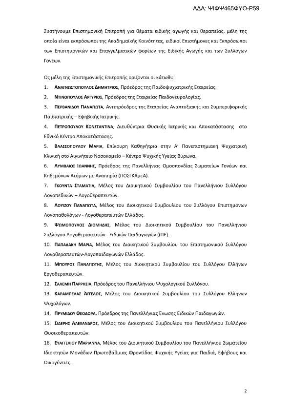 Σύσταση και ορισμός μελών Επιστημονικής Επιτροπής για θέματα ειδικής αγωγής και θεραπείας στο Υπουργείο Υγείας