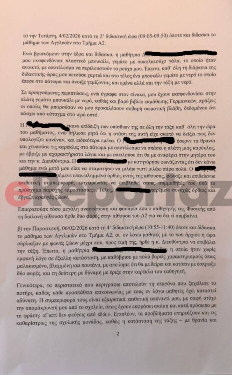 Στην αναφορά της η καθηγήτρια από τη Θεσσαλονίκη, περιέγραφε περιστατικά ακραίου εκφοβισμου που, όπως υποστήριζε, βίωνε. Ένα από τα περιστατικά στο οποίο αναφέρεται, έγινε στις αρχές Φεβρουαρίου του 2026 όταν μαθήτριά της πέταξε ένα πλαστικό μπουκάλι γεμάτο με σοκολατούχο γάλα, το οποίο ήταν ανοικτό, με αποτέλεσμα να περιλουστούν τα ρούχα της.