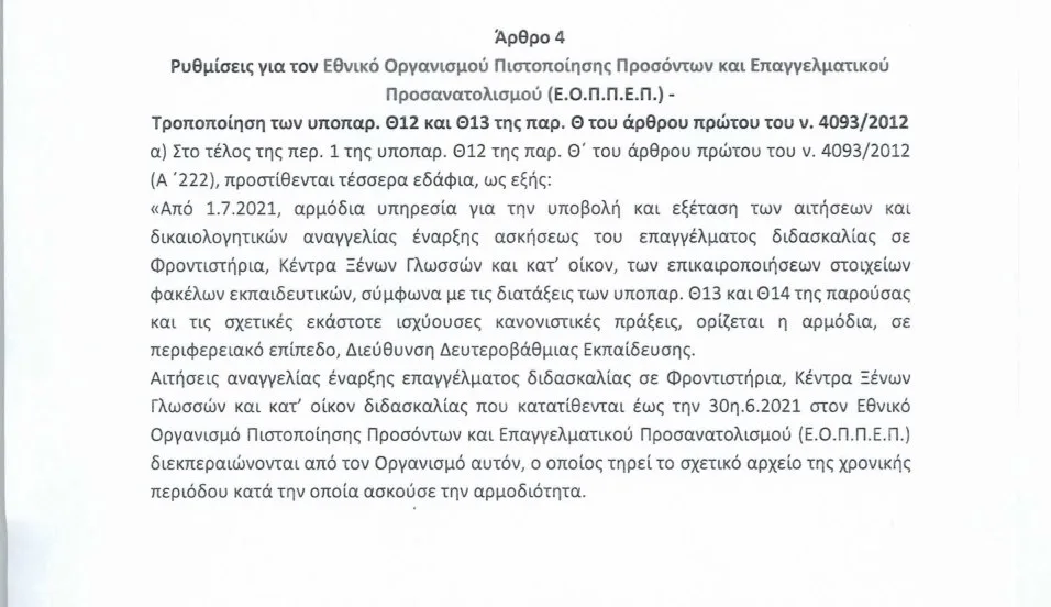 Με τροπολογία επί του νομοσχεδίου προς ψήφιση στη Βουλή, για την επαγγελματική εκπαιδευση, μετατίθεται από 1 Ιουίου 2021, η αρμοδιότητα σχετικά με την διαδικασία για την άδεια διδασκαλίας σε Φροντιστήρια και Κέντρα Ξένων Γλωσσών καθώς και η υποβολή των δικαιολογητικών και των αιτήσεων αναγγελίας έναρξης ασκήσεως επαγγέλματος διδασκαλίας σε Φροντιστήρια, Κέντρα Ξένων Γλωσσών και κατ οίκον , καθώς και για τις επικαιροποιήσεις στα στοιχεία των εκπαιδευτικών, από τον ΕΟΠΠΕΠ στις κατά τόπους Δευτεροβάθμιες.