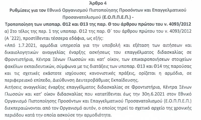 Συγκεκριμένα η τροπολογία αναφέρει, πώς η η αρμοδιότητα της υποβολής και εξέτασης των αιτήσεων και δικαιολογητικών αναγγελίας έναρξης ασκήσεως του επαγγέλματος διδασκαλίας σε Φροντιστήρια, Κέντρα Ξένων Γλωσσών και κατ οίκον αλλά και των , καθώς και των επικαιροποιήεων στοιχείων φακέλων εκπαιδευτικών, περιέρχεται από τον ΕΟΠΠΕΠ στις Διευθύνσεις Εκπαίδευσης.