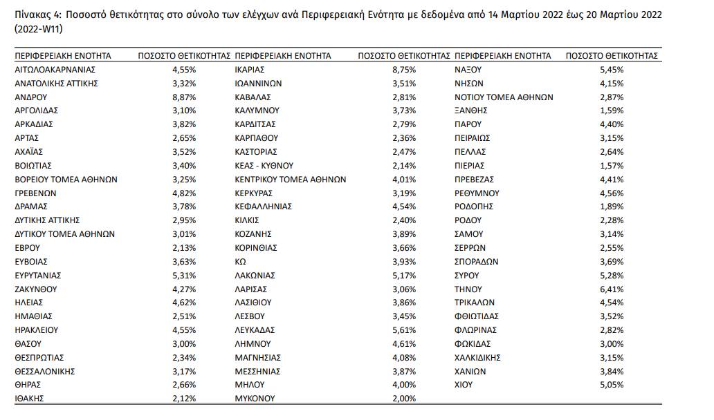 Την εβδομάδα αναφοράς, το ποσοστό θετικότητας ήταν 7.68% σε σύνολο 1.976.746 εργαστηριακών ελέγχων (RT-PCR/Rapid-Ag) και 1.50% σε σύνολο 2.719.989 αυτοδιαγνωστικών ελέγχων. Στο σύνολο των ελέγχων, το ποσοστό θετικότητας ήταν 3.26%.