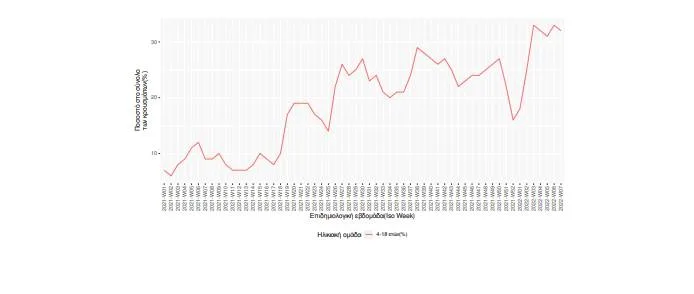 Σχολεία: Στα ίδια επίπεδα παρέμειναν οι μολύνσεις στην ηλικιακή ομάδα 4 ως 18 ετών την τρίτη εβδομάδα του Φεβρουαρίου. Μειώθηκε η θετικότητα