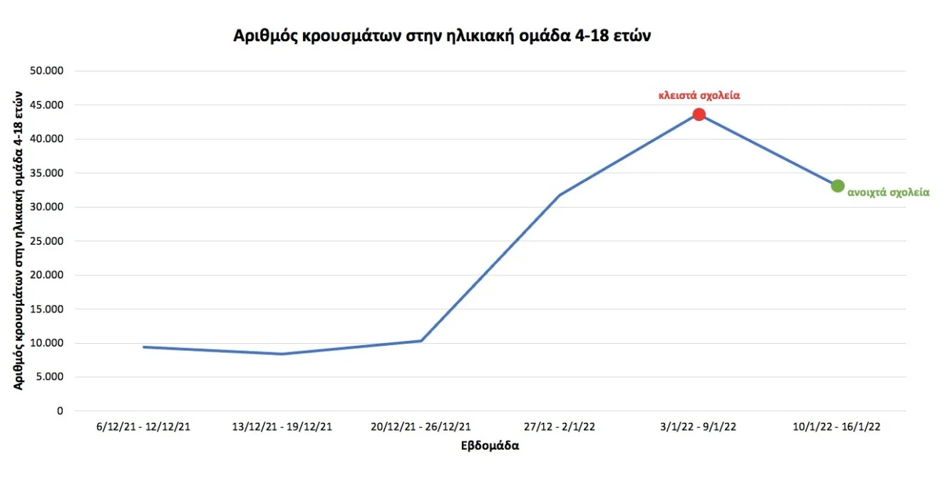 Αναλυτικά, σύμφωνα με σημερινά στοιχεία του ΕΟΔΥ, κατά την πρώτη εβδομάδα λειτουργίας των σχολείων εντοπίστηκαν 10.414 λιγότεροι μαθητές ηλικίας 4-18 ετών θετικοί στον κορωνοϊό, απ’ ό,τι την τελευταία εβδομάδα των διακοπών των Χριστουγέννων (από 43.608 θετικά κρούσματα μαθητών μείωση σε 33.194), και παρά το γεγονός ότι τα τεστ σε αυτή την ηλικιακή ομάδα αυξήθηκαν ραγδαία την πρώτη εβδομάδα λειτουργίας των σχολείων. (βλ. συν. πίνακα)