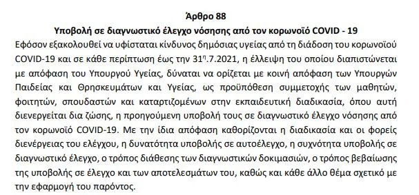 Συγκεκριμένα, στο άρθρο 88 αναφέρει πώς μαθητές, φοιτητές αλλά και σπουδαστές θα μπορούν να συμμετέχουν στην εκπαιδευτική διαδικασία εφόσον έχουν υποβληθεί σε διαγνωστικό έλεγχο νόσησης από τον COVID-19.