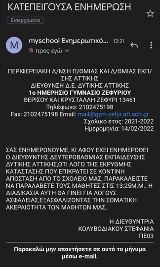 « Σας ενημερώνουμε κι αφού έχει ενημερωθεί ο διευθυντής της Δευτεροβάθμιας εκπαίδευσης Δυτικής Αττικής ότι λόγω της έκρυθμης κατάστασης που επικρατεί σε κοντινή απόσταση από το σχολείο μας, παρακαλείστε να παραλάβετε τους μαθητές στις 13.25. Η διαδικασία αυτή θα γίνει για λόγους ασφάλειας, εξασφαλίζοντας την σωματική ακεραιότητα των μαθητών μας».