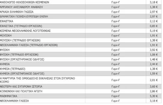 Ο τιμοκατάλογος των σχολικών βιβλίων των Δημοτικού, Γυμνασίου και Λυκείου, για το σχολικό έτος 2022-23. Αναλυτικά οι τιμές όλων των βιβλίων των Δημοτικού, Γυμνασίου και Λυκείου, για το σχολικό έτος 2022-23. Δημοτικό Γυμνάσιο Α Γυμνασίου Β Γυμνασίου Γ Γυμνασίου Λύκειο Γενικής παιδείας Προσανατολισμού Ανθρωπιστικών Σπουδών Προσανατολισμού Θετικών Σπουδών Προσανατολισμού Θετικών Σπουδών και Σπουδών Υγείας Προσανατολισμού […]