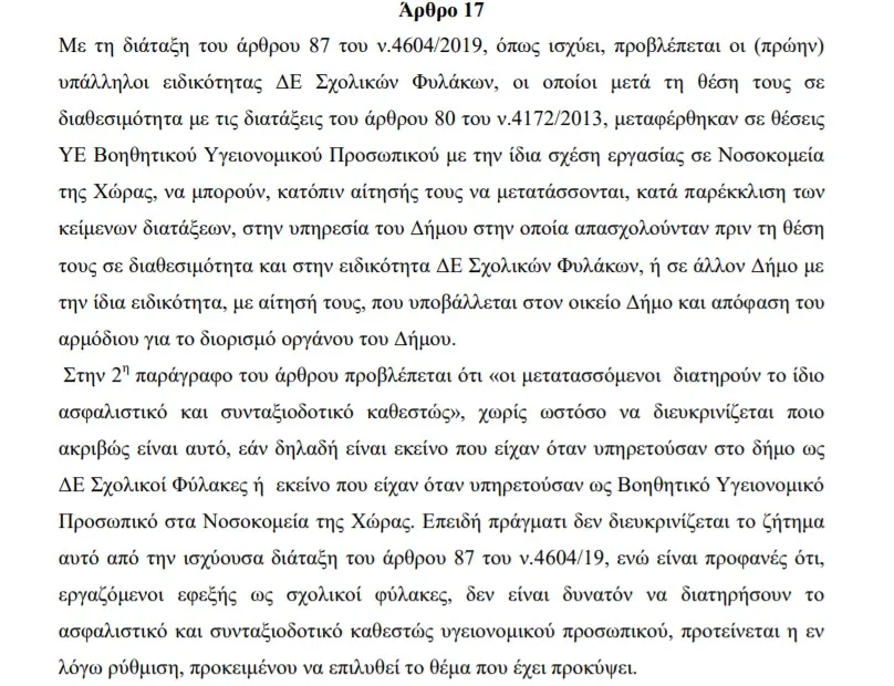 Την δυνατότητα μετατάξεων στους δήμους «κατά παρέκκλιση των κείμενων διατάξεων», δίνει στους σχολικούς φύλακες που μεταφέρθηκαν σε νοσοκομεία, διάταξη νομοσχεδίου του ΥΠΕΣ που δόθηκε σε δημόσια διαβούλευση.