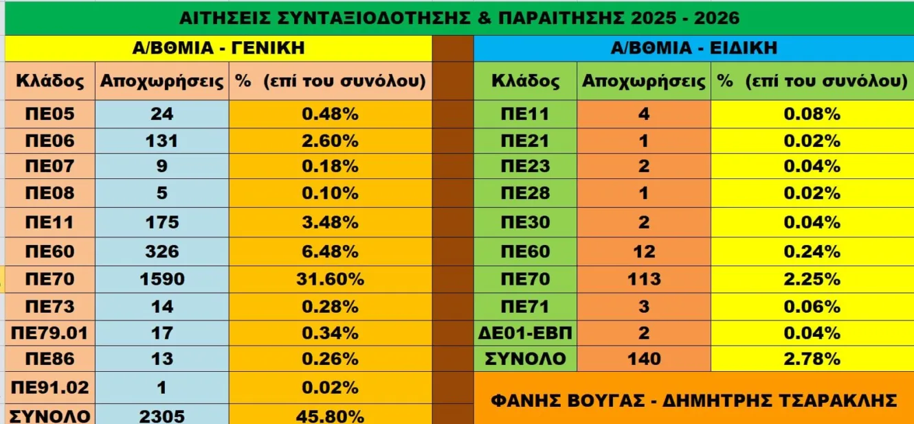 Τα στοιχεία για τις αιτήσεις συνταξιοδότησης και παραίτησης εκπαιδευτικών για την περίοδο 2025-2026 που παρουσιάζονται στον παρακάτω πίνακα επιμέλειας των εκπαιδευτικών Φάνη Βούγα και Δημήτρη Τσαρακλή, αποτυπώνουν με σαφήνεια την πραγματική εικόνα των αποχωρήσεων ανά κλάδο, τόσο στη γενική όσο και στην ειδική αγωγή. Τα ποσοστά των αποχωρήσεων επί του συνόλου δείχνουν ποιες ειδικότητες επηρεάζονται περισσότερο και ταυτόχρονα δημιουργούν ένα σαφές πλαίσιο για το τι πρέπει να ακολουθήσει σε επίπεδο διορισμών.