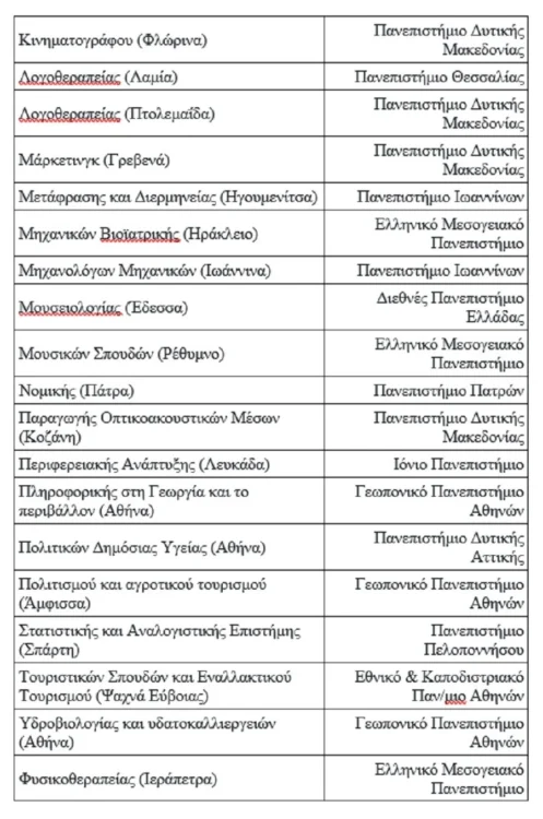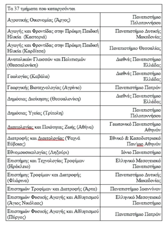 Δείτε ποιά τμήματα ΑΕΙ κλείνουν – Με πρόταση από την Εθνική Αρχή Ανώτατης Εκπαίδευσης (ΕΘΑΑΕ) και την «υπογραφή» της κυβέρνησης φαίνεται ότι μπαίνει οριστικό τέλος στη λειτουργία 37 πανεπιστημιακών τμημάτων, που επρόκειτο να λειτουργήσουν σε Αθήνα , Θεσσαλονίκη και σχεδόν όλες τις μεγάλες πόλεις της χώρας.