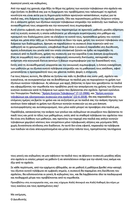 Ο Διευθυντής, σε κάθε περίπτωση, ξεκαθαρίζει ότι, από σήμερα «αν σε κάποιον μαθητή ή μαθήτρια βρεθεί έξυπνο κινητό τηλέφωνο σε εμφανές σημείο, η συσκευή θα παραμένει στη διεύθυνση του σχολείου, θα ειδοποιούνται οι γονείς και οι κηδεμόνες του, και θα λαμβάνονται όλα τα παιδαγωγικά και πειθαρχικά μέτρα που προβλέπονται από τη νομοθεσία».